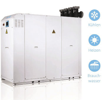 Walter Meier, 11.1 B40, präsentiert die hocheffiziente Energiestation, ein modular aufgebautes System mit Kaltwassererzeuger und Wärmepumpe, das im Kältekreislauf das natürliche Kältemittel R290 (Propan) verwendet. Siehe auch Webcode 305998.