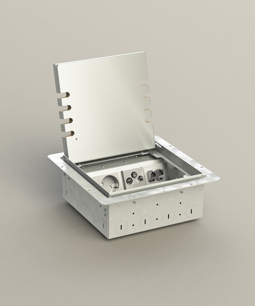 BS Bodensteckdosen Systemtechnik, 9.0-A10: Der höhenverstellbare Hohlbodentank 8908H bietet acht Steckplätze und ist mit Unterbaurahmen für Hohlböden geeignet. Die Aufnahmebox besteht aus sendzimirverzinktem Stahlblech, Rahmen und Deckel sind aus Edelstahl. Der herausnehmbare Klappdeckel schließt auch bei gesteckten Standardsteckern in gerader oder abgewinkelter Form und kann mit 15 mm Bodenbelag besetzt werden.