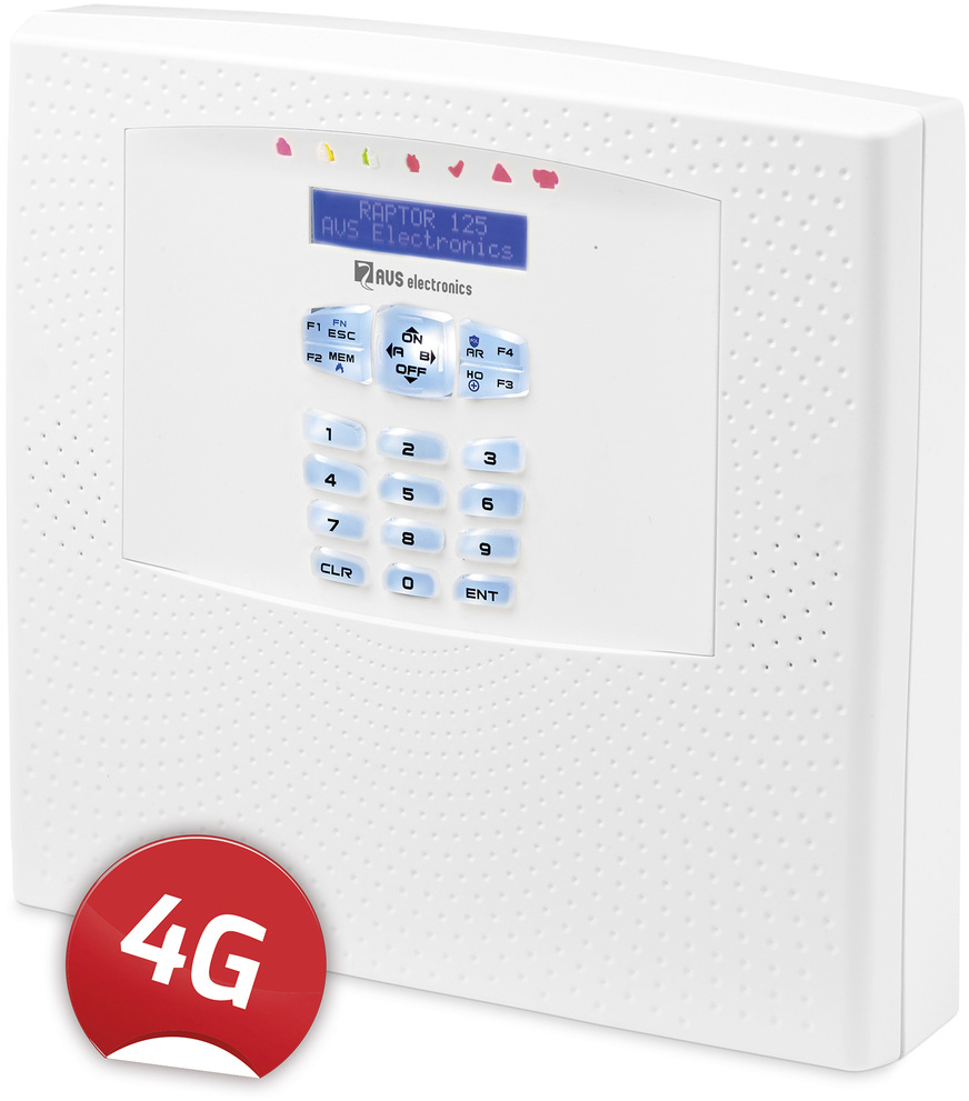 Armantis / AVS Electronics, 9.1-D80: Die Einbruchmeldeanlage Raptor RK 4G überwacht bis zu 125 Melder und sendet Alarmmeldungen über das 4G-Mobilfunknetz. Mit integriertem Funkmodul, Innensirene und GSM/GPRS-Übertragungsgerät eignet sie sich für private und gewerbliche Gebäude und für mobile Einrichtungen. Hohe Sicherheit bieten bidirektionale Funk-Kommunikation und Rolling-Code-Verfahren. Per PIN-Code, Mifare-Transponder, Handsender oder App wird die Anlage scharf und unscharf geschaltet.