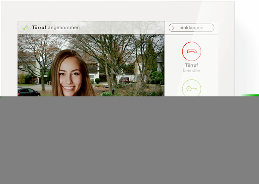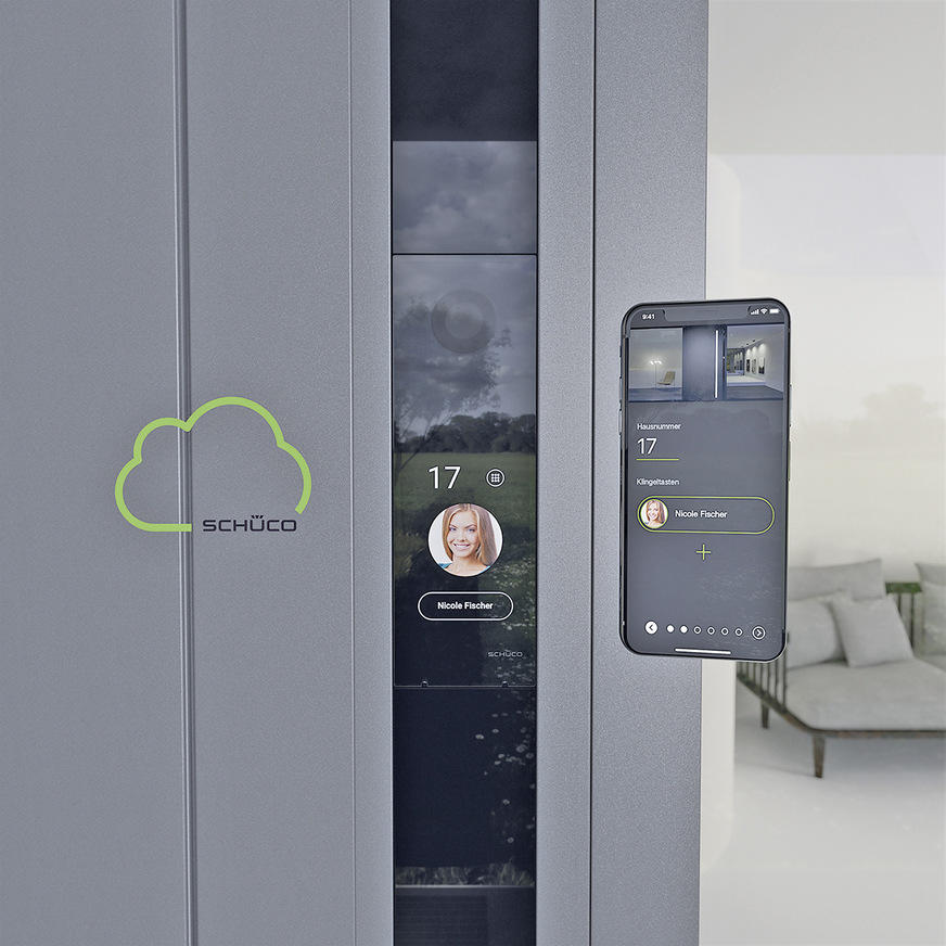 Schüco, 11.1-B51: Das Türmanagementsystem Schüco Door Control System (DCS) SmartTouch kombiniert Audio- und Video-Türkommunikation mit Zutrittskontrolle. Über eine App kann unabhängig vom Klingelsignal auf die Full-HD-Kamera und das Mikrofon zugegriffen und die Tür automatisch von überall geöffnet werden. So lässt sich mit Personen vor der Tür kommunizieren, die Tür öffnen oder nur überwachen, wer sich vor der Tür befindet.