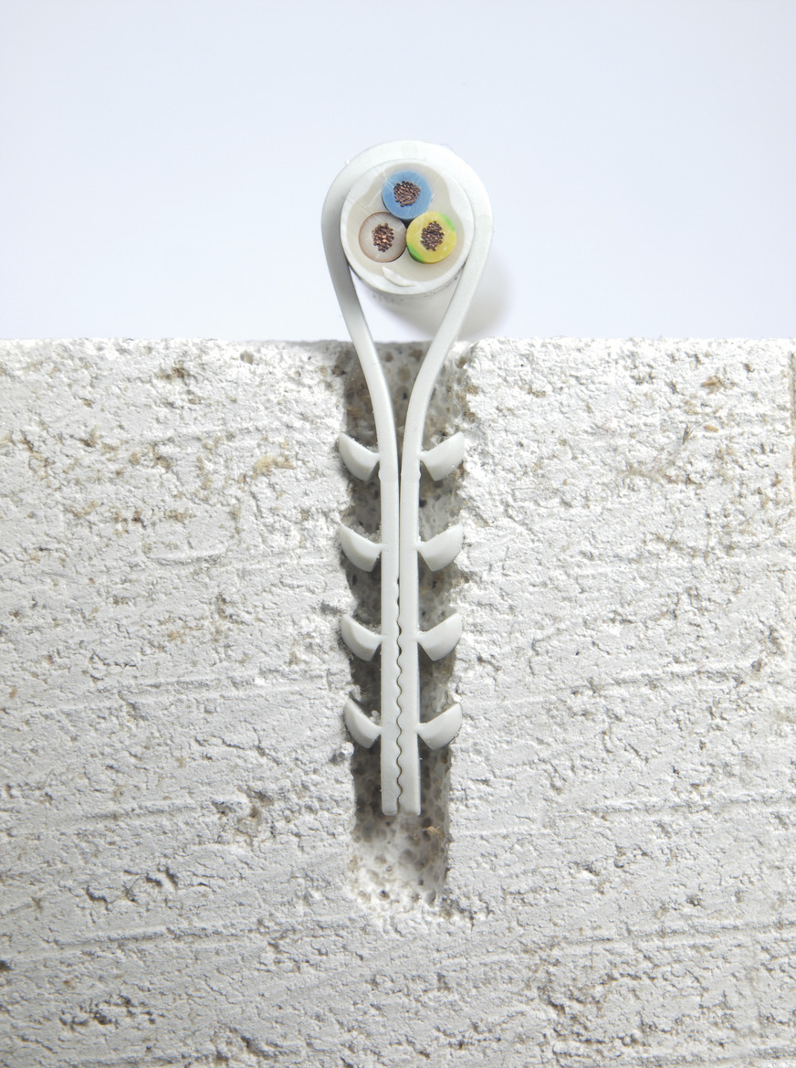 Schnabl, 12.1-E31: Die Dübelklemmschelle (DKS) vereinfacht seit über 40 Jahren die Verlegung von Einzelleitungen und Leitungsbündeln. Mit einer Verzahnung an der Schlaufeninnenseite verfügt die DKS 4.0 jetzt über noch mehr Haltekraft und Rutschsicherheit. Auch die Außenseite der DKS 4.0 wurde mit verstärkten Exzenterzähnen optimiert.