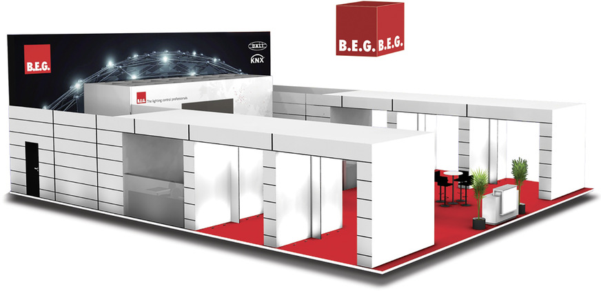 B.E.G., 12.1-E03: Im „B.E.G. Quartier“ auf der Light + Building befinden sich ein Bürokomplex, eine Industrieanlage, eine Schule und ein Hotel – jeweils mit vier Räumen und intelligenten Lösungen zur Gebäudeautomation. Zudem wird Lichtqualität in Räumen mit biologisch wirksamer Beleuchtung erlebbar. Dazu laufen die Wechselzyklen der Human-Centric-Lighting-Steuerung beschleunigt ab.