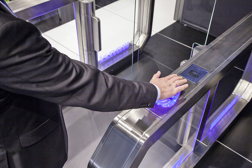 Wanzl / PCS, 9.1-B30: Die Zutrittsschleuse Galaxy Gate von Wanzl ermöglicht durch die Verknüpfung mit dem System Intus PS von PCS eine Authentifizierung mittels Handvenenscan. Das biometrische Verfahren funktioniert sehr schnell und eine Annäherung der Hand an die integrierte Infrarotkamera ist ausreichend für den Scan. Das Zutrittssystem ermöglicht so auch höhere Durchgangsfrequenzen.