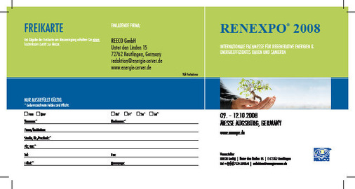 Angesprochen werden Architekten, Ingenieure, Planer, Handwerker, Kommunen, Investoren, Bauindustrie, Wohnungswirtschaft und Bauherren. Begleitet wird die Messe von mehreren Fachtagungen zu den Themen Gebäudemodernisierung, Bauen mit nachwachsenden Rohstoffen, Kraft-Wärme-Kopplung, Wärmepumpen und Solare Klimatisierung. Dabei stehen Praxisbeispiele ebenso im Fokus wie künftige Perspektiven. Der Messebereich der Renexpo ist täglich von 9.00 bis 18.00 Uhr, am Sonntag bis 17.00 Uhr geöffnet. Donnerstag und Freitag sind Fachbesuchertage. Mit der unten stehenden Gastkarte haben Sie zum Ausstellungsbereich freien Eintritt. JV