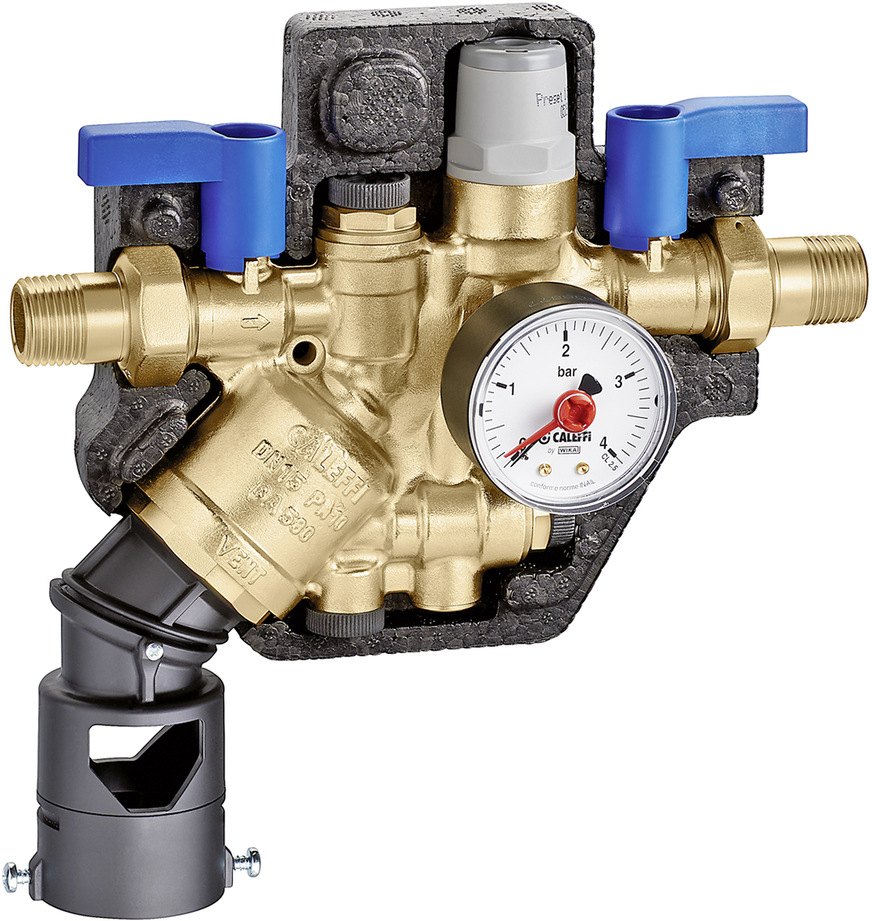 Caleffi, 3A26: Die Füllkombi 580 besteht aus zwei Absperrventilen, einem Systemtrenner (Typ BA) und einer automatischen Füllarmatur. Die Armatur hält den Anlagendruck stabil auf einem eingestellten Wert und sorgt für den automatischen Nachlauf bei einer Unterschreitung des eingestellten Solldrucks in der Heizungsanlage. Die Monoblock-Kartusche beinhaltet den eingangsseitigen Rückflussverhinderer, das Ablassventil und das gesamte Aktivierungssystem.
