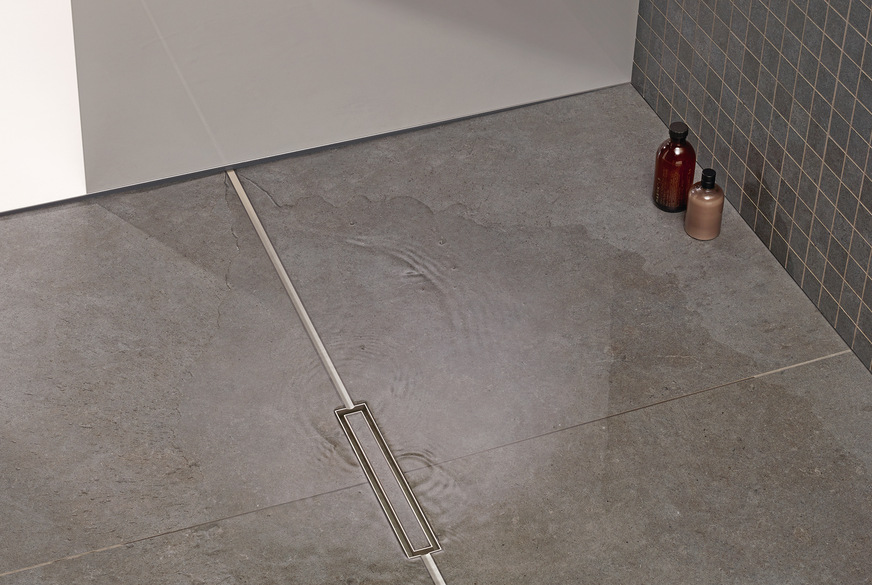 Dallmer 7E02: Die Duschrinnen CeraFloor Individual und CeraFrame Individual (Bild) sind befliesbar, zudem ist wählbar, ob das Entwässerungssystem einen Akzent in der Duschfläche – beispielsweise durch Farben – setzt oder nahezu in der Architektur des Badezimmers verschwindet.