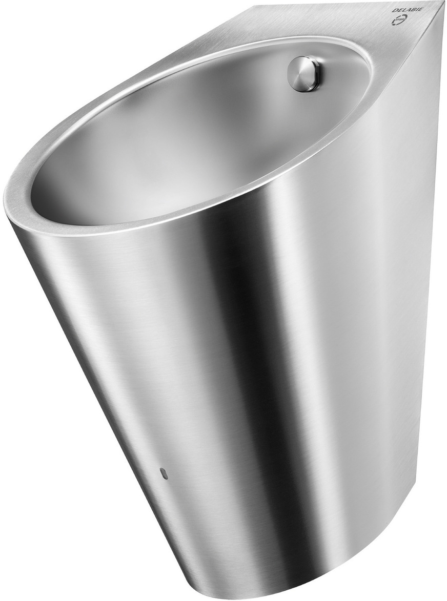 Delabie, 8B05: Das Urinal Hybrimatic Fino ermöglicht mit einem Hybrid-Spülsystem einen sehr geringen Wasserverbrauch. Dazu sind ein verdeckter Flüssigkeitssensor und die batteriebetriebene Elektronik im Urinal integriert. Das Membranventil arbeitet ohne Sperrflüssigkeit. Die Wasserspülung (voreingestellt auf 0,07 l/s) nach jeder Nutzung erfolgt im Eco-Programm für 1 s und für 3 s im Komfort-Programm. Dazu kommen ein Stoßzeit-Programm und eine Hygienespülung.