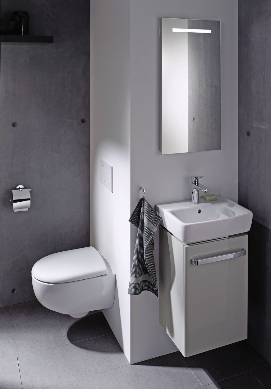 Geberit, 6E06: Der Waschtisch der Badserie Renova präsentiert sich ohne Ecken und Kanten, dafür mit gerader Seitenführung und vergrößerter Ablagefläche. Er ist in vier Größen als Waschtisch und in drei Größen als Handwaschbecken erhältlich. Mit geschlossener Außenkontur, verkürzter Ausladung sowie verdeckten Befestigungen kann mit dem spülrandlosen Renova Compact Wand-WC auch ein kleines Gästebad stilvoll modernisiert werden.
