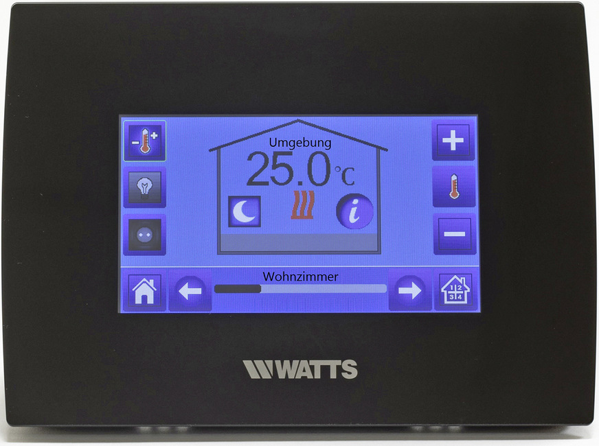 Watts, 1B13: Die Smart-Heating-Lösung WattsVision bietet individuelle Zeitprogramme für bis zu 50 Zonen und Räume. Neben den elektronischen Funk-Thermostaten sind auch Funk-Regelverteiler für Flächenheizungen/-kühlungen sowie 25 Ein/Aus- und Licht-Schaltungen vernetzbar. Der Zugriff ist auch per App (iOS, Android) möglich.