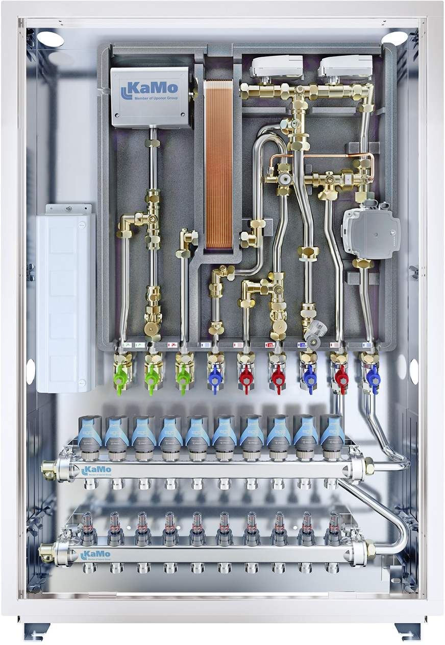 KaMo / Uponor, 1C15: Combi Port E ist eine Wohnungsstation, bei der sowohl die Trinkwassererwärmung als auch die Heizungsversorgung vollelektronisch und adaptiv geregelt werden. Zudem hält ein einzigartiges Design die Bereiche für Heizung und Trinkwasser streng getrennt. Dadurch wird das Kaltwasser nicht unnötig vom Heizbereich erwärmt, was laut Anbieter das Legionellen-Risiko im Trinkwasser signifikant senkt.