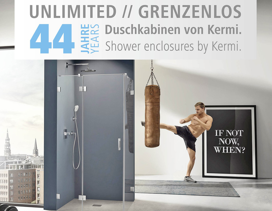 Kermi Duschdesign, 8A35, lädt zum Erleben des Mottos „Unlimited / Grenzenlos“ ein. Das Jahr 2020 steht ganz im Zeichen des 44-jährigen Duschkabinenjubiläums. Kermi präsentiert unter anderem das Programm Dark Edition, einzigartige Jubiläumsartikel und neue Serienmodelle beim bewährten Alleskönner Liga.
