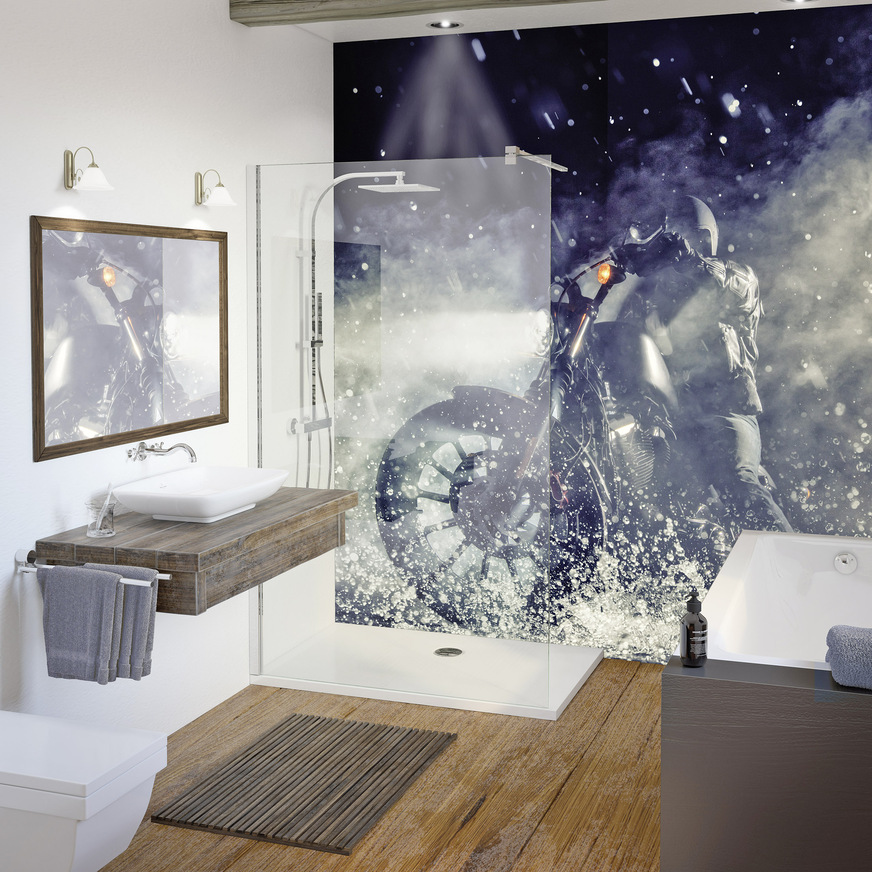 Duschwelten, 6C18: DecoMotion steht für vor Ort zuschneidbare Duschrückwände zur schnellen Teilsanierung im Bad, vor allem bei einem Wechsel von Wanne zu Dusche. Die 3 mm starke Aluminium-Verbundplatte mit Kern aus Polyethylen sind in einer großen Vielfalt mit Fliesen-, Stein- und Holzoptik bis zu auffallenden Motiven erhältlich. Zudem ist die Herstellung von Unikaten mit Kundenmotiven möglich.