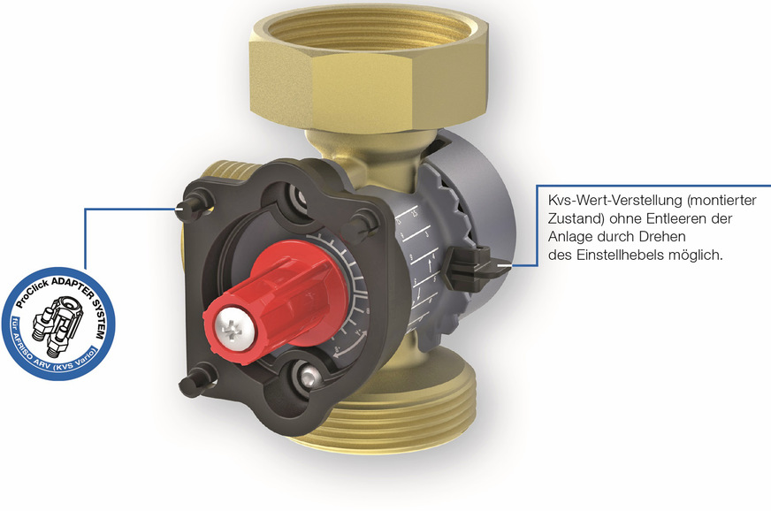 Afriso-Euro-Index, 2E33: Das 3-Wege-Mischventil ARV 325 ermöglicht es, den Kvs-Wert jederzeit nach Bedarf über eine äußere Skala zwischen 2,5 und 12 m3/h einzustellen, ohne die Anlage zu entleeren. Ebenso unkompliziert ist die Handhabung bis ins Detail: Ein Adapter am Mischventil dient zur werkzeuglosen Befestigung des Afriso-Stellmotors ARM ProClick an der richtigen Position.