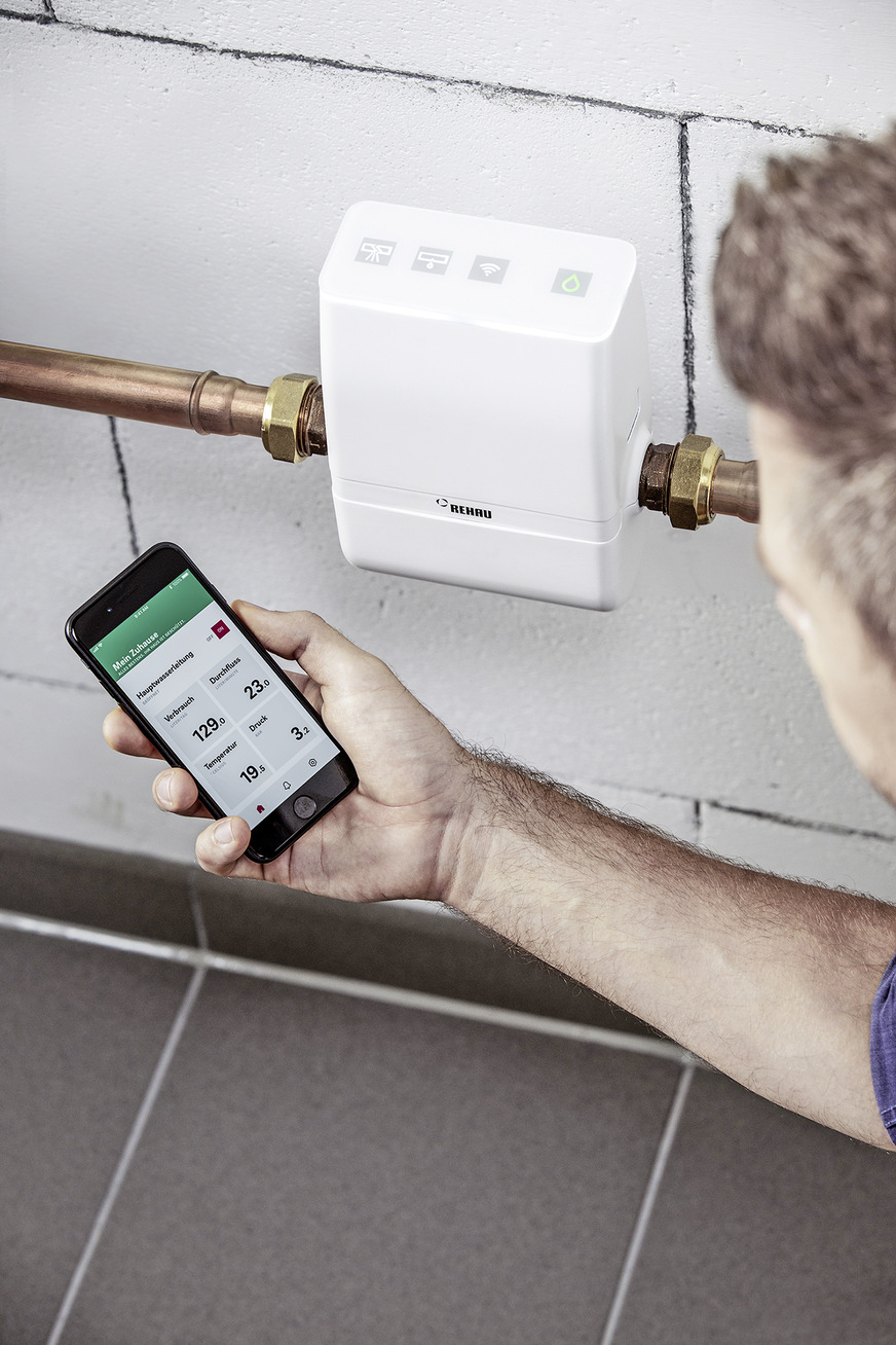Rehau, 1A14: Die Wassersteuerung RE.Guard überwacht die Trinkwasser-Installation auf unkontrolliert austretendes Wasser. Das Monitoring-Tool für Ein- und Zweifamilienhäuser überwacht den Wasserdurchfluss mit Ultraschalltechnik und beurteilt ihn mit der integrierten Software in Echtzeit. Wird eine Unregelmäßigkeit erkannt, schaltet das System die Hauptwasserleitung ab. Zusätzlich können Wassermelder an sensiblen Stellen platziert werden. Die Steuerung erfolgt über eine App.
