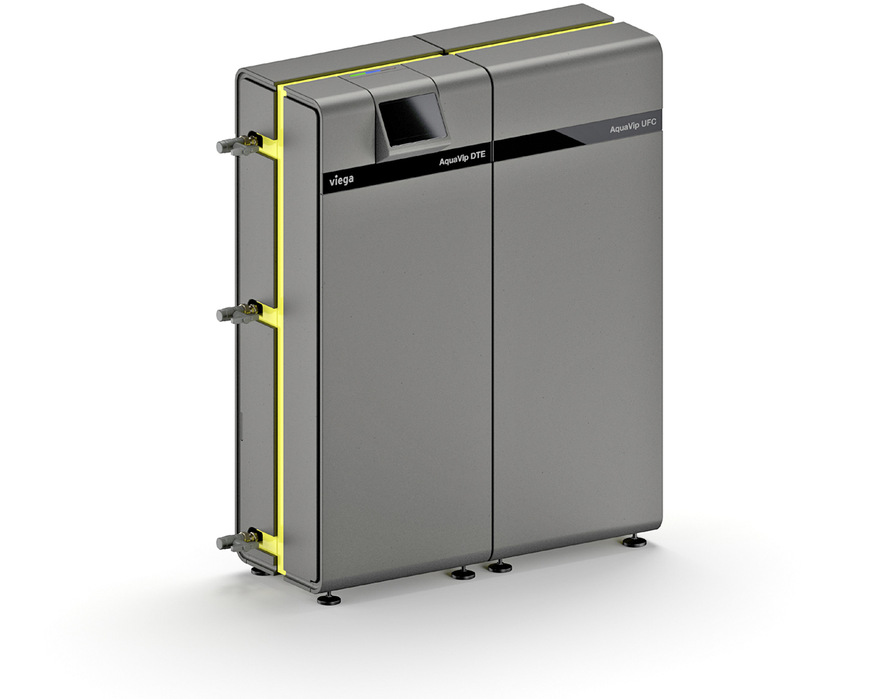 Viega, 6E04, erweitert sein Trinkwasser-Management-System AquaVip Solutions um das WC-Element Prevista-Dry mit integrierter AquaVip-Spülstation, automatisch auslösende Auslaufarmaturen, elektronische Zirkulationsregulierventile sowie die Temperierung von Trinkwasser mit dem Durchfluss-Trinkwassererwärmer AquaVip DTE für Trinkwasser warm und dem Durchfluss-Trinkwasserkühler AquaVip DTK für Trinkwasser kalt.