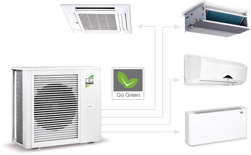 Remko, 3D31: Beim Klimasystem Aqua-Multiflex wird Wasser als Energieträger verwendet. Lediglich im geschlossenen Kreislauf des Kaltwasser-Erzeugers ist Kältemittel im Einsatz. Der Kaltwasser-Erzeuger wird in vier Größen zwischen 5,6 und 20 kW Kälteleistung angeboten. Zwischen zwei und sechs Innengeräte können angeschlossen werden. Wand- und Truhengeräte sowie Deckenkassetten sind frei kombinierbar.