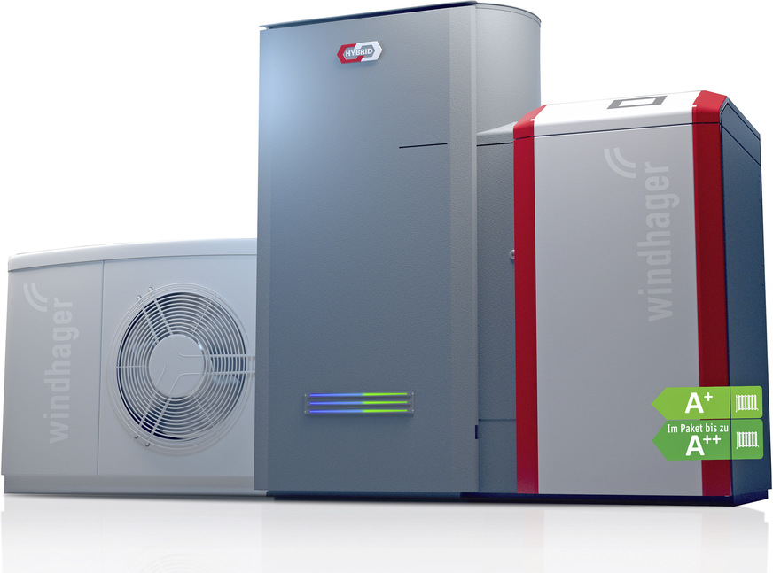 Windhager, 3D45: Die Hybridlösung BioWIN2 kombiniert den Pellet-Heizkessel BioWIN2 Touch mit der Monoblock-Luft/Wasser-Wärmepumpe AeroWIN Klassik. Durch die „Smart-Flow-Hydraulik“ kann BioWIN2 Hybrid (vier Leistungsgrößen von 10 bis 26 kW) ohne Pufferspeicher und ohne Elektroheizstab betrieben werden. Der Vorratsbehälter fasst 200 kg Holzpellets.