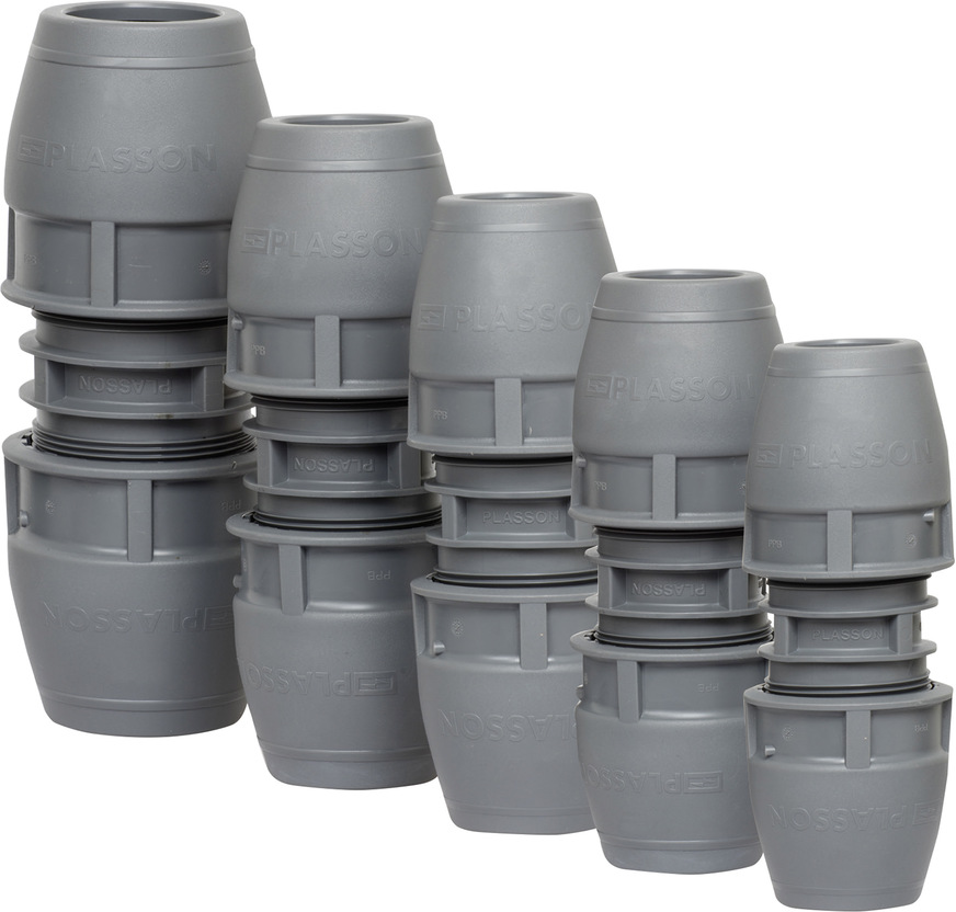 Plasson, 5C03: Die Universalkupplung der Serie 19 ermöglicht Rohrverbindungen von gleichen oder verschiedenen Rohrwerkstoffen im Dimensionsbereich d20 bis d63. Durch einen großen Toleranzbereich lassen sich Kunststoffrohrleitungen aus PE-LD, PE 63, 80 und 100, PE-X, PP-R, PVC-U, PB und ABS sowie Metallrohrleitungen aus Blei, Kupfer und Stahl miteinander verbinden.