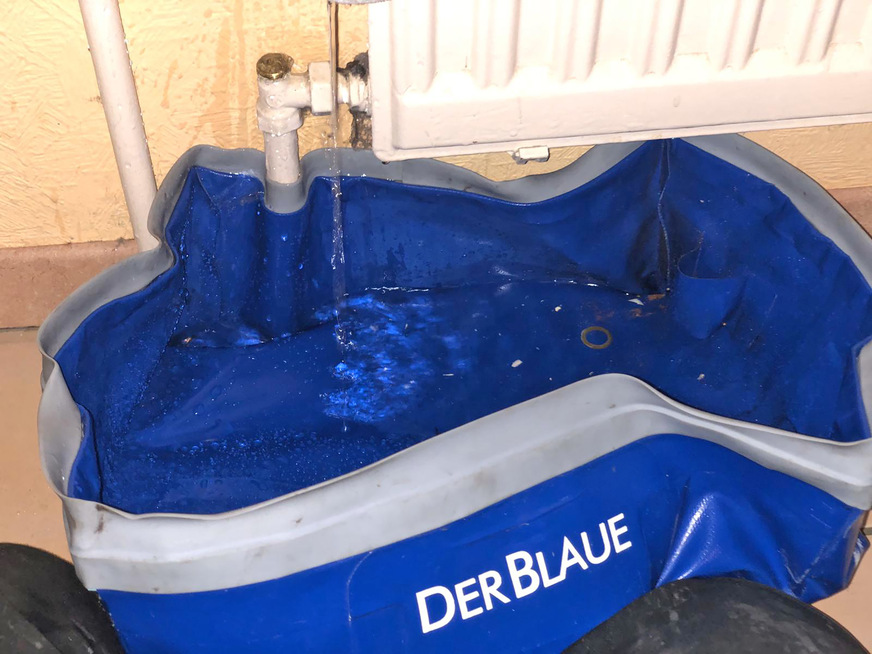 Kiesel & Schmidt, 1C40: Der Blaue ist ein Wasserauffangsystem. Es besteht aus einer formbaren und formstabilen Wanne mit eingebautem Biegemetall und einer oberseitigen Dichtlippe. Die Wanne lässt sich hinter Rohre platzieren und bleibt formstabil stehen. Mit einer akkubetriebenen Tauchpumpe lässt sich das Wasser aus der Wanne herauspumpen.