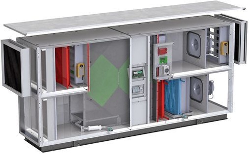 Die Lüftungsgeräte der Serie Duplex Multi-N zur Dachinstallation mit Volumenstromleistungen von 300 bis 8000 m 3 /h werden bodenliegend aufgestellt und zeichnen sich durch eine sehr flache Bauart aus. Die EC-Motoren erfüllen die ErP-Werte für 2015, der Wärmerückgewinnungsgrad erreicht bis zu 93 % und der Wärmebrückenfaktor beträgt TB2. http://www.airflow.de