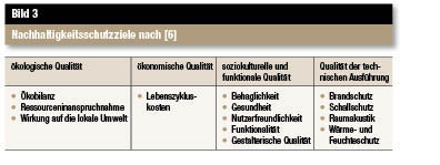 Ein Beispiel dafür ist das Zertifizierungssystem der DGNB (Deutsche Gesellschaft für nachhaltiges Bauen), die Schutzziele und Nachhaltigkeitskriterien definiert (Bild 3), die wiederum durch detaillierte Kriterien untersetzt werden können. Allerdings kann es in der Planung äußerst schwierig werden, sie entsprechend dieser Leitlinien umzusetzen, weil der reale Planungsprozess nach teilweise diametralen Kriterien abläuft, beispielsweise