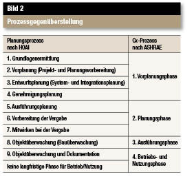 Bild 2 zeigt eine Gegenüberstellung zwischen dem im Preisrecht der HOAI [8] hinterlegten Planungsprozess und dem Cx-Prozess. Während die HOAI eine stärkere Untergliederung in den Planungsphasen vornimmt und in der oft nicht beauftragten Objektbetreuung nur die Funktionsüberprüfung im Rahmen der Gewährleistung ausweist, umfasst der Cx-Prozess auch die Betriebs- und Nutzungsphase.