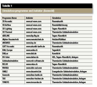 Hierzulande wird eine ganze Reihe von Software-Lösungen zur Gebäudesimulation angeboten (siehe Tabelle). Ein Großteil davon stammt aus den USA und Skandinavien. Da viele Programme ihren Ursprung im universitären Bereich haben, ist die Bedienung teilweise wenig komfortabel. So verfügen (meist kostenlos erhältliche) Lösungen immer noch über eine Ein- und Ausgabe in Form von Textdateien. Die meisten kommerziell vertriebenen Produkte sind aber längst an den Windows-Standard angepasst. Alle Programme liefern gute Ergebnisse, lediglich die Form der Ausgabe (Text/Grafik) ist sehr unterschiedlich. Mit der Bandbreite der Funktionen und Einsatzmöglichkeiten steigt auch der Preis für die Software. Die Preise für Simulationsprogramme liegen zwischen 1000 und mehreren Tausend Euro.