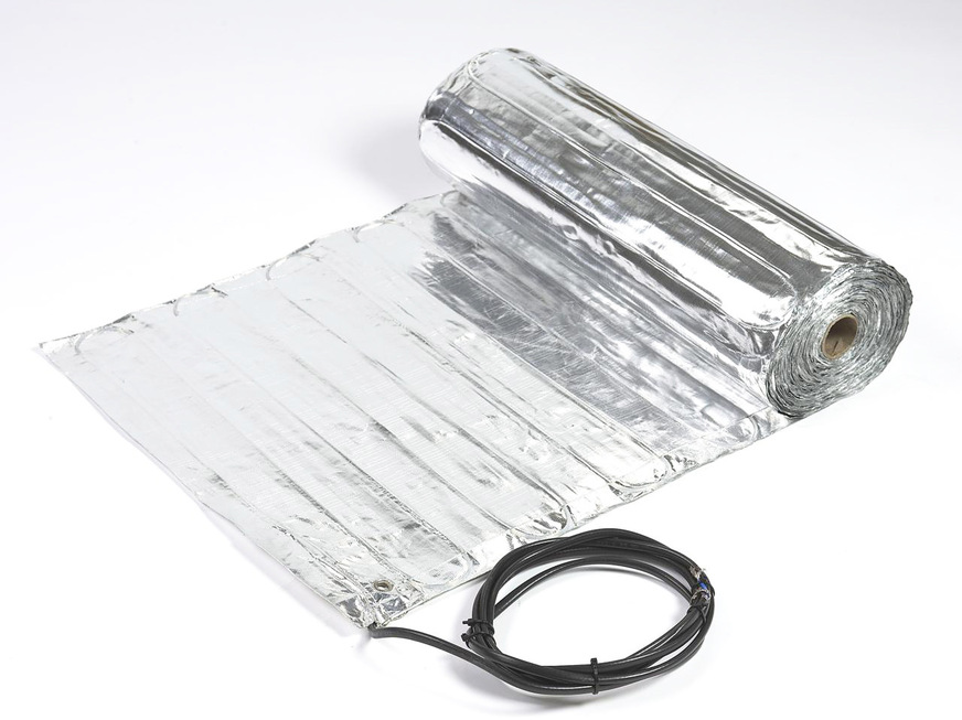 Die Elektro-Alu-Heizmatte ist 3 mm dick und wird direkt unter dem Bodenbelag ausgerollt. Sie ist 50 cm breit und in Größen zwischen 1 und 10 m2 verfügbar. Der Anschluss (230 V) erfolgt über ein Zweileiterkabel. Die Wärmeleistung von 140 W/m2 wird laut Anbieter mit einer maximalen Oberflächentemperatur von 28 °C abgegeben. Durch die oberbelagsnahe Verlegung ist die Reaktionszeit sehr kurz.
