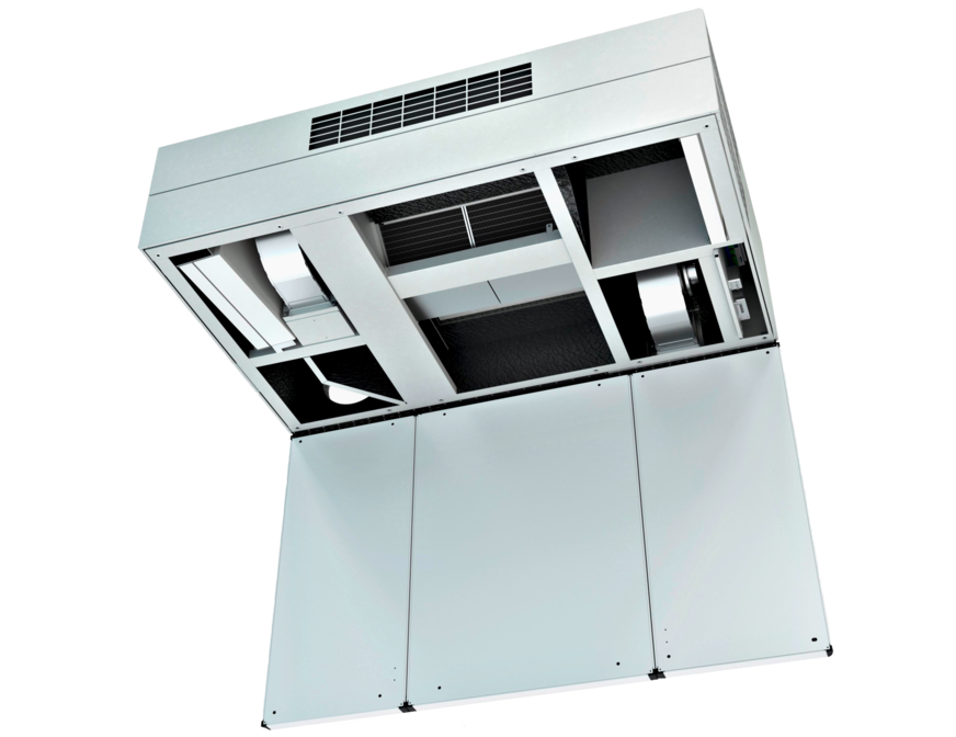 Das kompakte Gehäuse der DEX3000-Geräte besteht aus korrosionsbeständigem, mit Aluzink beschichtetem Stahlblech (AZ 185-C4). Es wird standardmäßig weißlackiert (RAL 9003) und kann optional auch andersfarbig geliefert werden. Drei scharnierte Türen erleichtern den Wartungszugang. Die Wärmerückgewinnung über einen Gegenstrom-Wärmeübertrager aus Aluminium erreicht einen Temperaturwirkungsgrad von bis zu 80 %. Eine Vorfilteroption und ein breites Filtersortiment ermöglichen eine anwendungsbezogene Auswahl der Filterklasse.