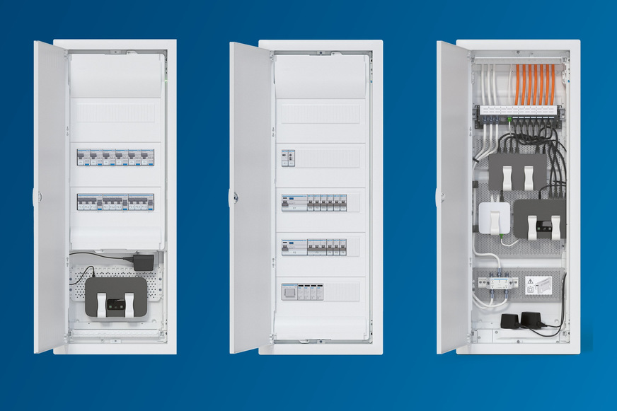 Mit dem Multimedia-Verteiler lassen sich die entsprechenden Anforderungen der DIN 18015 für Mehrraumwohnungen erfüllen: Er bietet Platz für Kommunikationskomponenten wie Router, Switch oder Telefonanlagen, die übersichtlich auf segmentierten Lochblechen montiert werden können. Zudem gibt es für die Patchmodule ein eigenes Patch-Panel und in allen Verteilern ist eine Dreifachsteckdose mit drehbaren Töpfen und erhöhtem Berührungsschutz montiert. Der Multimedia-Verteiler ist wie der Stromkreis-Verteiler als Hohlwand-, Unter- und Aufputzausführung erhältlich.
