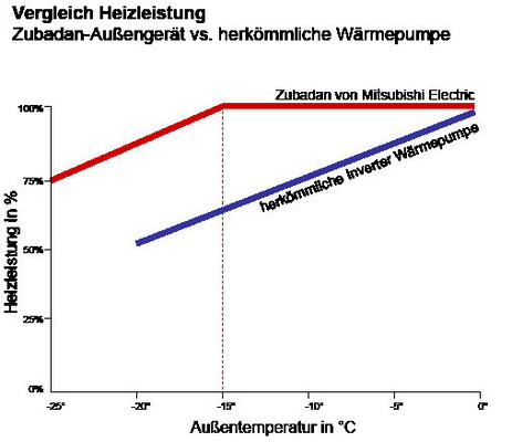 Mitsubishi Electric hat jetzt eine sehr interessante Lösung für schwerpunktmäßig im Heizbetrieb arbeitende Klimageräte entwickelt. Selbst bei sehr tiefen Temperaturen, nämlich bis –15 °C Außentemperatur bieten die neuen Zubadan-Inverter (japanisch: Super Heizen) eine konstante Heizleistung. Sie wird durch eine „Flash Injection“, ähnlich einer zweistufigen Verdichtung, erreicht. Durch die Flash Injection konnten zudem der Abtaubetrieb verkürzt und die Abtauintervalle verlängert werden. Für die in die Energieeffizienzklasse A eingestuften Zubadan-Inverter ist der Einsatzbereich im Heizbetrieb auf –25 °C erweitert worden. Die Zubadans können im Außenbereich aufgestellt werden (BHT: 950 × 330 × 1350 mm) und werden mit den Mr. Slim Wandgeräten, Kanaleinbaugeräten und 4-Wege-Deckenkassetten kombiniert. Lieferbar sind ab April Geräte mit Heizleistungen von 8,0 bis 14,0 kW.