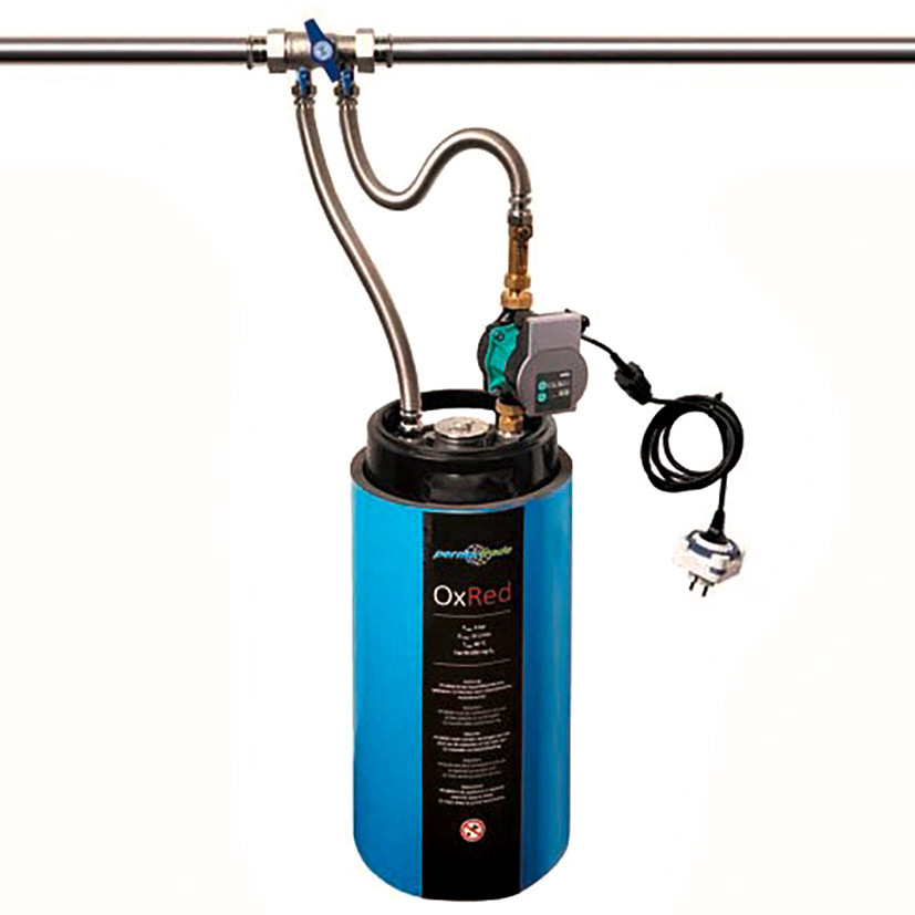Für kleinere „Sauerstoff-Problemanlagen“ bietet perma-trade die Sauerstoffzehrpatrone OxRed flow an. Sie wurde zur Festinstallation entwickelt und ist mit einer eigenen Pumpengruppe mit Abgleichventil und Zeitschaltuhr sowie Edelstahlwellrohren und einer Bypass-Armatur ausgestattet. Im Volumenstrom durch die OxRed flow wird Sauerstoff fast vollständig gezehrt.