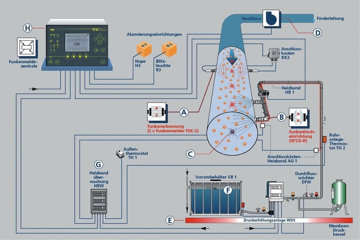 In pneumatischen Transporteinrichtungen und mechanischen Förderanlagen, in denen brennbare Materialien transportiert werden, kommt es durch Funkenflug immer wieder zu Bränden und Filterexplosionen. Der Funkenflug wird meistens durch die eingesetzten Maschinen oder durch Materialverunreinigungen erzeugt. Um die Gefährdung von Menschenleben, hohe Sachschäden und Produktionsausfälle auszuschließen, müssen Absauganlagen auf Funkenflug überwacht und durch Funkenlöschanlagen gesichert werden. Die neueste Zentralengeneration von T&B entspricht den VdS-Richtlinien und schützt Fördereinrichtungen, Filter und Silos. Die Funkenmelder erkennen geringste infrarote Strahlen und melden diese an die Funkenmeldezentrale. Von hier aus wird dann im Millisekundenbereich die Löscheinrichtung angesteuert und Löschwasser über Spezialdüsen in die Absaugleitung eingedüst. Der Funkenflug muss diesen Löschnebel passieren und wird dabei abgelöscht. Durch eine neu entwickelte Löschautomatik kann T&B sehr geringe Abstände zwischen Funkenerkennung und Löschung realisieren. In allen Förderleitungen zum Filter und Spänesilo sollte nach dem Ventilator eine Funkenerkennung (A) und eine Funkenlöscheinrichtung (B) eingebaut werden. Die Funkenerkennung besteht aus mindestens zwei Funkenmeldern, welche den gesamten Rohrleitungsquerschnitt überwachen. Die Funkenlöscheinrichtung besteht aus einem schnell öffnenden Magnetventil sowie mindestens einer Löschdüse. Gegen Verschmutzung sind die Löschdüsen mit einem Verschluss versehen. Die Löschung wird so lange aufrechterhalten, bis der letzte erkannte Funken (C) die Löschstrecke passiert hat, dann schließt die Löschautomatik selbstständig. Die Funkenlöschanlage bleibt weiterhin einsatzbereit. Die minimale Löschzeit beträgt fünf Sekunden und verlängert sich automatisch bei andauerndem Funkenflug. Durch eine einstellbare Funkenschwelle kann eine Maschinenabschaltung (D) vorgenommen werden. Die Anzahl der erkannten Funken, sowie die Auslöseschwelle werden in der Funkenmeldezentrale angezeigt. Um ein einwandfreies Sprühbild erzeugen zu können, muss ein Fließdruck von mindestens 5 bar vorhanden sein. Ist dies nicht der Fall, kommt eine Druckerhöhungsanlage (E) zum Einsatz. Der Löschwasseranschluss an eine vorhandene Sprinkleranlage ist möglich. Die Funkenmelder haben eingebaute Testeinrichtungen. So kann für jeden Funkenmelder von der Funkenmeldezentrale die Funktionstüchtigkeit überprüft werden. Die neue Generation der Funkenmeldezentralen BM 6 (H) hat eine automatische Meldertesteinrichtung, sodass der manuelle Meldertest entfällt.