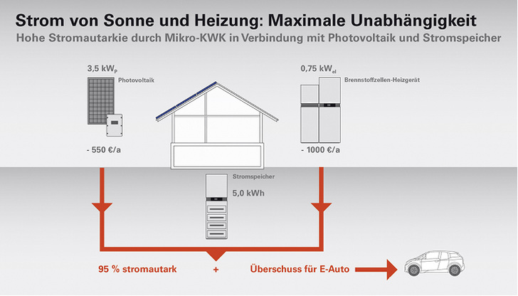 Bis zu 95 % Autarkie vom öffentlichen Stromnetz können Anlagenbetreiber nach Angaben von Viessmann mit Energiemanagementsystemen erreichen, die auf die Kombination von Stromspeicher, PV-Anlagen und Brennstoffzellen-Heizgerät Vitovalor 300-P oder den Mikro-KWK-Geräten Vitotwin 300-W und 350-F mit Stirling-Motor zugreifen können. Die Vitovolt-PV-Module bieten Leistungen bis zu 300 W p , sodass etwa 20 m 2 Modulfläche ausreichen, um den Strombedarf eines durchschnittlichen Haushalts im Sommer komplett zu decken. Ein Vitocharge-Stromspeicher mit einer Speicherkapazität ab 2,5 kWh bevorratet überschüssigen Strom aus dem Mikro-KWK-Gerät und der PV-Anlage zur Deckung späterer Strom-Verbrauchsspitzen. So wird der Eigenstromverbrauch maximiert und der Zukauf von Netzstrom minimiert. Ist der Stromspeicher vollständig geladen, kann weiterer Eigenstrom entweder für die Ladestation eines Elektrofahrzeugs genutzt oder ins öffentliche Netz eingespeist werden. Das Strommanagement einschließlich der Eigenstromoptimierung ist im Vitocharge-Stromspeicher bereits integriert.