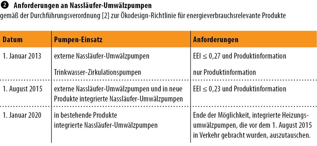 [2] Verordnung (EG) Nr. 641/2009 der Kommission vom 22. Juli 2009 zur Durchführung der Richtlinie 2005/32/EG des Europäischen Parlaments und des Rates im Hinblick auf die Festlegung von Anforderungen an die umweltgerechte Gestaltung von externen Nassläufer-Umwälzpumpen und in Produkte integrierten Nassläufer-Umwälzpumpen. Und: Verordnung (EU) Nr. 622/2012 der Kommission vom 11. Juli 2012 zur Änderung der Verordnung (EG) Nr. 641/2009 in Bezug auf die Anforderungen an die umweltgerechte Gestaltung von externen Nassläufer-Umwälzpumpen und in Produkte integrierten Nassläufer-Umwälzpumpen. Download über Webcode 336841