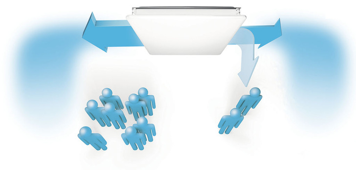 - Durch diese dynamische Anpassung der Strömungscharakteristik des Luftauslasses wird der ohne Zugluftrisiko nutzbare Teillastbereich deutlich erweitert.