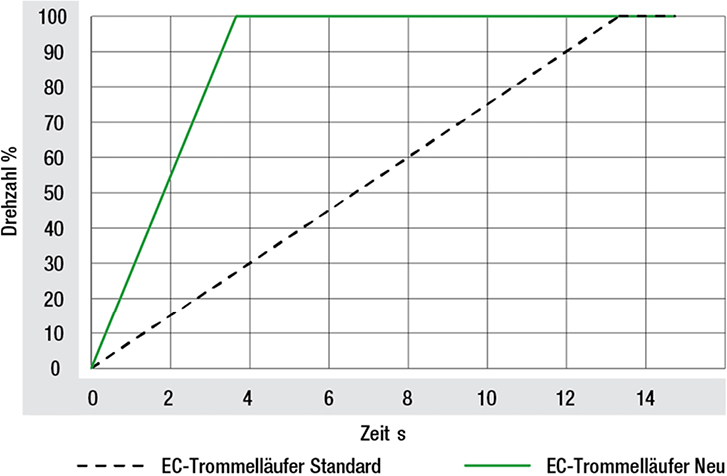 - Für Anwendungen, die einen schnellen Hochlauf erfordern, stehen seit Kurzem EC-Trommelläufer-Ventilatoren mit den gleichen Vorteilen zur Verfügung.
