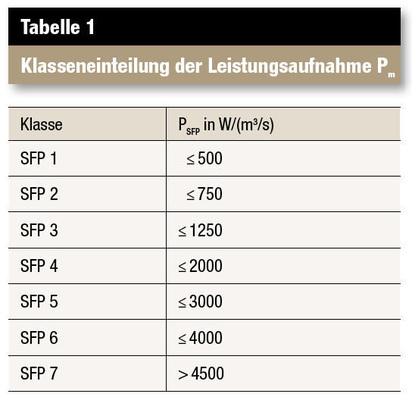 Die aufgenommene Leistung der gesamten RLT-Anlage wird durch die SFP-Klassen der EN 13779 definiert. Die spezifische Ventilatorleistung (Specific Fan Power) beschreibt die Leistungsaufnahme, die notwendig ist, um einen Volumenstrom von 1 m 3 /s zu fördern. Sie stellt somit die Leistungsaufnahme (P m ) bezogen auf den Volumenstrom (q V ) dar. Die heute gültigen Klassen sind aus Tabelle 1 zu ersehen.