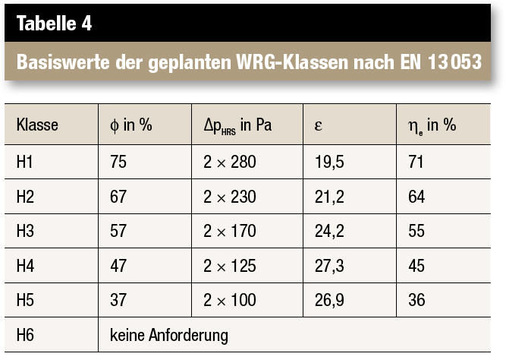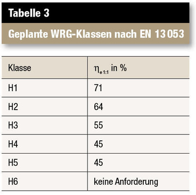 Tabelle 3 definiert die neuen WRG-Klassen in Abhängigkeit des energetischen Wirkungsgrades nach DIN EN 13053 bei ausgeglichenen Massenströmen von 1:1, also