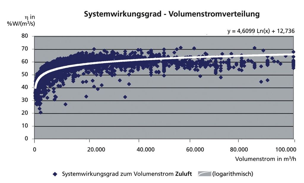 Die Analyse des Elektroenergiebedarfs von raumlufttechnischen Anlagen und Geräten darf sich nicht auf die Bewertung der Ventilatorantriebseinheit beschränken. Denn neben der Güte des Antriebsystems, beschrieben durch den Systemwirkungsgrad, spielt auch die Dimensionierung des Gesamtsystems im Hinblick auf einen niedrigen Druckabfall eine entscheidende Rolle.