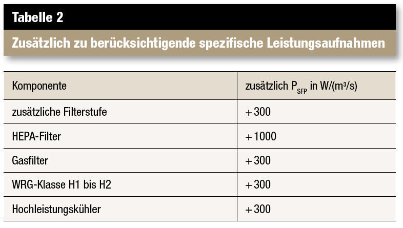 Nimmt man z.B. die durch die EnEV 2009 geforderte SFP-Klasse SFP 4, darf in der RLT-Anlage eine maximale Leistungsaufnahme von 2000 W/(m 3 /s) nicht überschritten werden. Für untypische Komponenten wie Schwebstofffilter, Gasfilter usw. wurden Zuschläge definiert, die in Ansatz gebracht werden können (Tabelle 2).
