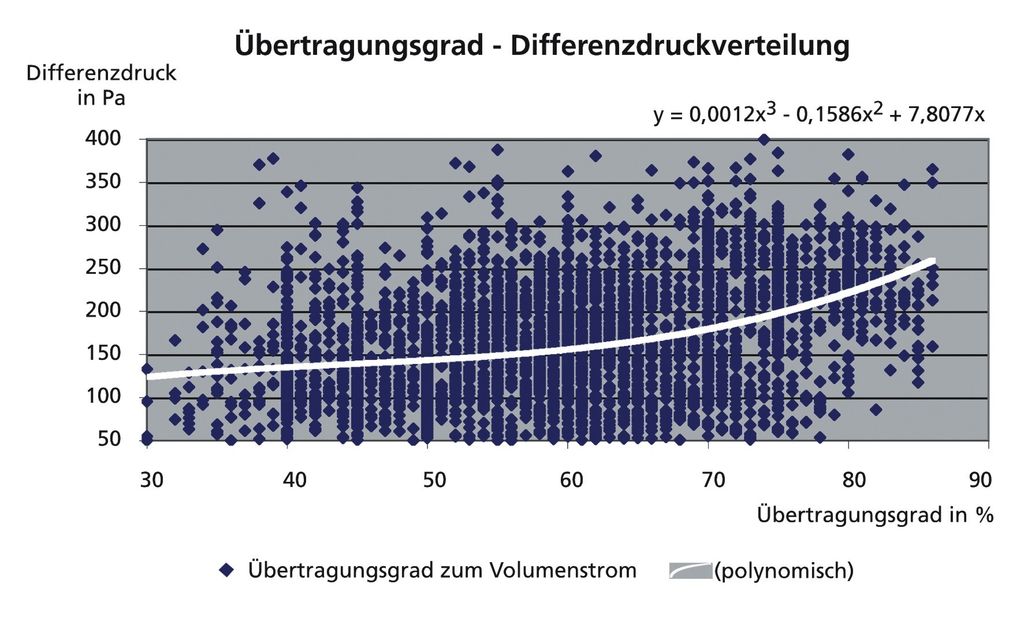 Der Zusammenhang von steigendem Differenzdruck und steigendem Übertragungsgrad kann auch statistisch aufgezeigt werden (Bild 19). Man erkennt aber auch anhand der großen Streuung, dass durch die Wahl des Strömungsquerschnittes niedrige Widerstände bei hohen Übertragungsgraden möglich sind.