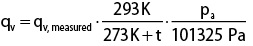 Der gemessene Luftvolumenstrom (q v,measured ), der durch die Leitungsleckage verursacht wird, muss anschließend mit dem maximal zulässigen Luftvolumenstrom der vereinbarten Luftdichtheitsklasse verglichen werden. Sofern bei der Prüfung nicht die Referenzbedingungen nach [2] oder [3] vorherrschen, was häufig der Fall ist, muss der gemessene Wert mit Gleichung 4 nach [3] korrigiert werden.