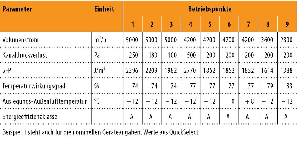 Gut nachvollziehbar ist, dass die gewählte Luftmenge und Druckleistung einen Einfluss auf die jeweilige Energieeffizienzklasse hat – dass aber auch die gewählte Außenlufttemperatur mit in die Bewertung einfließt, ist vielleicht etwas überraschend. In den Beispielen 5, 6 und 7 von Abb. 3 wurde lediglich die Außenlufttemperatur geändert, wodurch sich die Energieeffizienzklasse von C bei –12 °C bis auf A bei +8 °C verbessert. Die Begründung hierfür liegt darin, dass der Temperaturwirkungsgrad in wärmeren Klimazonen eine geringere Bedeutung für die gesamte Energiebetrachtung hat, als dies in kälteren Regionen, z.B. in Skandinavien, der Fall ist. Dagegen hat der Energieaufwand für die Motoren (SFP) einen stärkeren Einfluss auf die Energieeffizienzklasse, wenn das Gerät in wärmeren Klimazonen mit hohen Außenlufttemperaturen eingesetzt wird.
