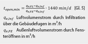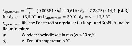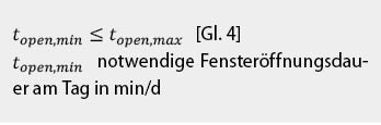 Soll über Fenster gelüftet werden, ist die maximale Fensteröffnungsdauer nach Gleichung 3 mit der minimalen Fensteröffnungsdauer nach Gleichung 5 gemäß Gleichung 4 zu vergleichen. In (3) ist deshalb auch die