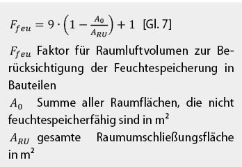 Beide Feuchtespeicherfälle werden auch erfüllt, wenn ohne Verbesserung der Wärmedämmung und Einrechnung einer Infiltration das Raumvolumen doppelt so groß wäre. Die neuartigen Grundrisskonstellationen, in denen die Bereiche Wohnen, Essen, Küche und Flur im Raumluftverbund ohne Innentüren zusammengelegt sind, sind deshalb hinsichtlich des Feuchteschutzes vorteilhaft. Das Gleiche gilt, wenn die Feuchtespeicherfähigkeit von Raumluft mit Bauteilen mindestens so groß ist, wie das zweifache Raumluftvolumen speichern kann (Faktor 2, siehe unten).