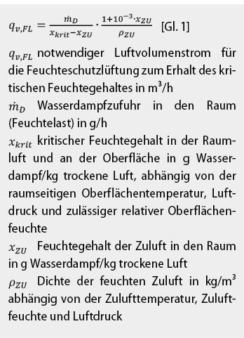 Den notwendigen Luftvolumenstrom für die Feuchteschutzlüftung erhält man mit Gleichung 1. Sie gilt für den Fall, dass die Feuchte sofort abgeführt werden soll. Adsorptions- und Desorptionsvorgänge, die zu einer Dämpfung des Feuchteverlaufs führen könnten, werden zunächst nicht berücksichtigt. Es wird stattdessen von einem längeren Zeitraum mit mittleren Verhältnissen ausgegangen.