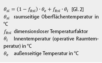 Die stationäre raumseitige Oberflächentemperatur des ungünstigsten Bauteilanschlusses ermittelt sich aus Gleichung 2. Für die Wahl der Innentemperatur sind die realen Betriebsverhältnisse der Heizung zu beachten. So wird etwa eine Auslegungsinnentemperatur im Bad von 24 °C nur bei Volllast erreicht, da die Heizkurve in der Regel auf eine niedrigere Innentemperatur eingestellt wird. Ebenso sollte im Schlafzimmer von einer Temperatur kleiner 20 °C ausgegangen werden, da hier die Heizleistung vermutlich gedrosselt wird. In unbeheizten Kellern folgt die Innentemperatur der Erdreichtemperatur.