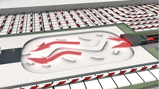 Anschließend wird die vortemperierte Zuluft über PluggFlex-Kanäle unterhalb der Klett-Fußbodenheizung zum Bodenpaneel geführt. Das Modul dient dann als Nachheizregister, indem es die Luft unterhalb der warmen oder kühlen Estrichfläche entlangführt und ihre Temperatur auf das gewünschte Niveau hebt oder senkt Abb. 3.