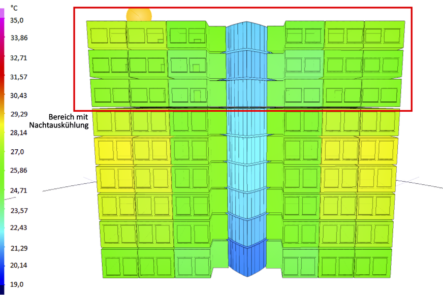 Die Simulation der Nachtauskühlung eines Bürogebäudes belegt die Effizienz dieser natürlichen Gebäudeklimatisierung – nicht nur für Passivhäuser oder stark gedämmte Gebäude, sondern auch für Bestandsgebäude.